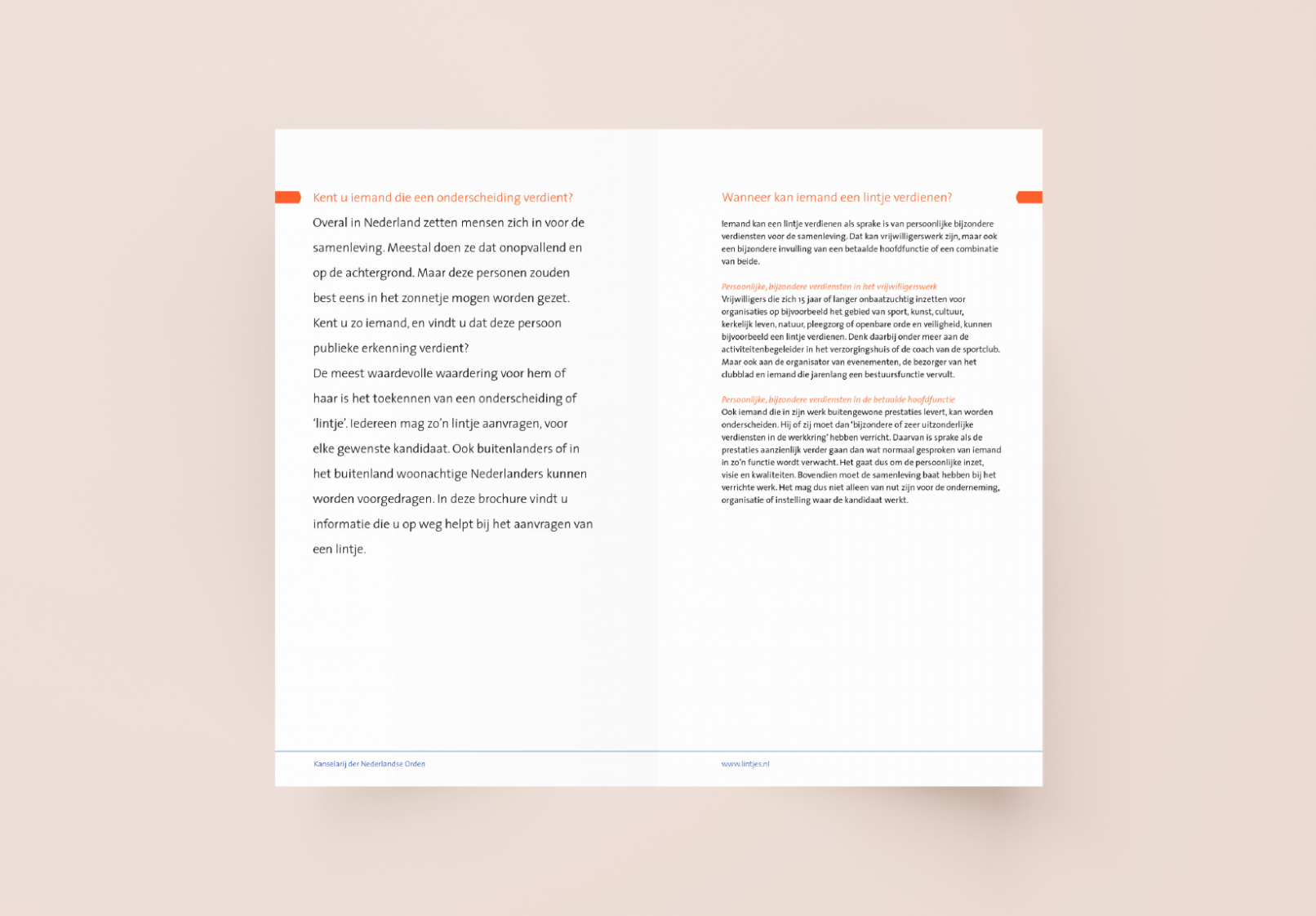 Samen met tekstschrijver Linda Glebbeek en fotograaf Ilya van Marle is er een nieuw concept ontwikkeld. Persoonlijke portretten en interviews van de gedecoreerden zijn samengebracht met praktische informatie over het aanvragen van een lintje. Deze informatie uiteraard gebonden met een oranje lintje.