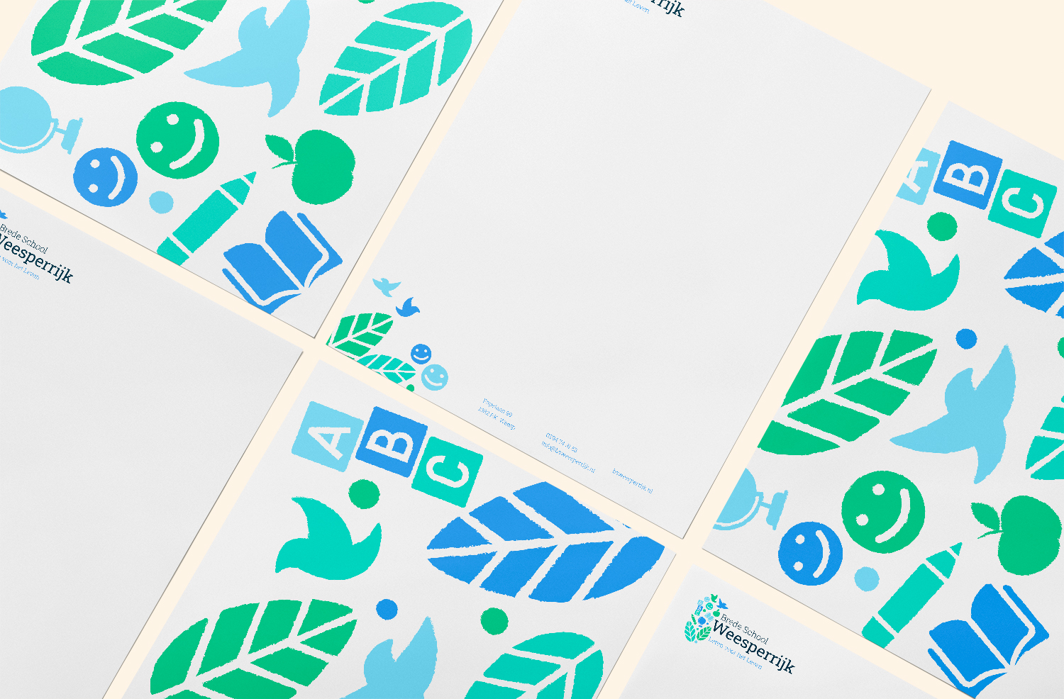 Een nieuwe wijk en een nieuwe school, daar hoort ook een nieuwe passende identiteit bij. Fris, vrolijk en eigentijds dat is de uitstraling die ik heb neergezet. Een logo en huisstijl wat past bij een klassieke bouwstijl in een moderne wijk. Eigentijdse illustraties vormen de basis van deze identiteit.